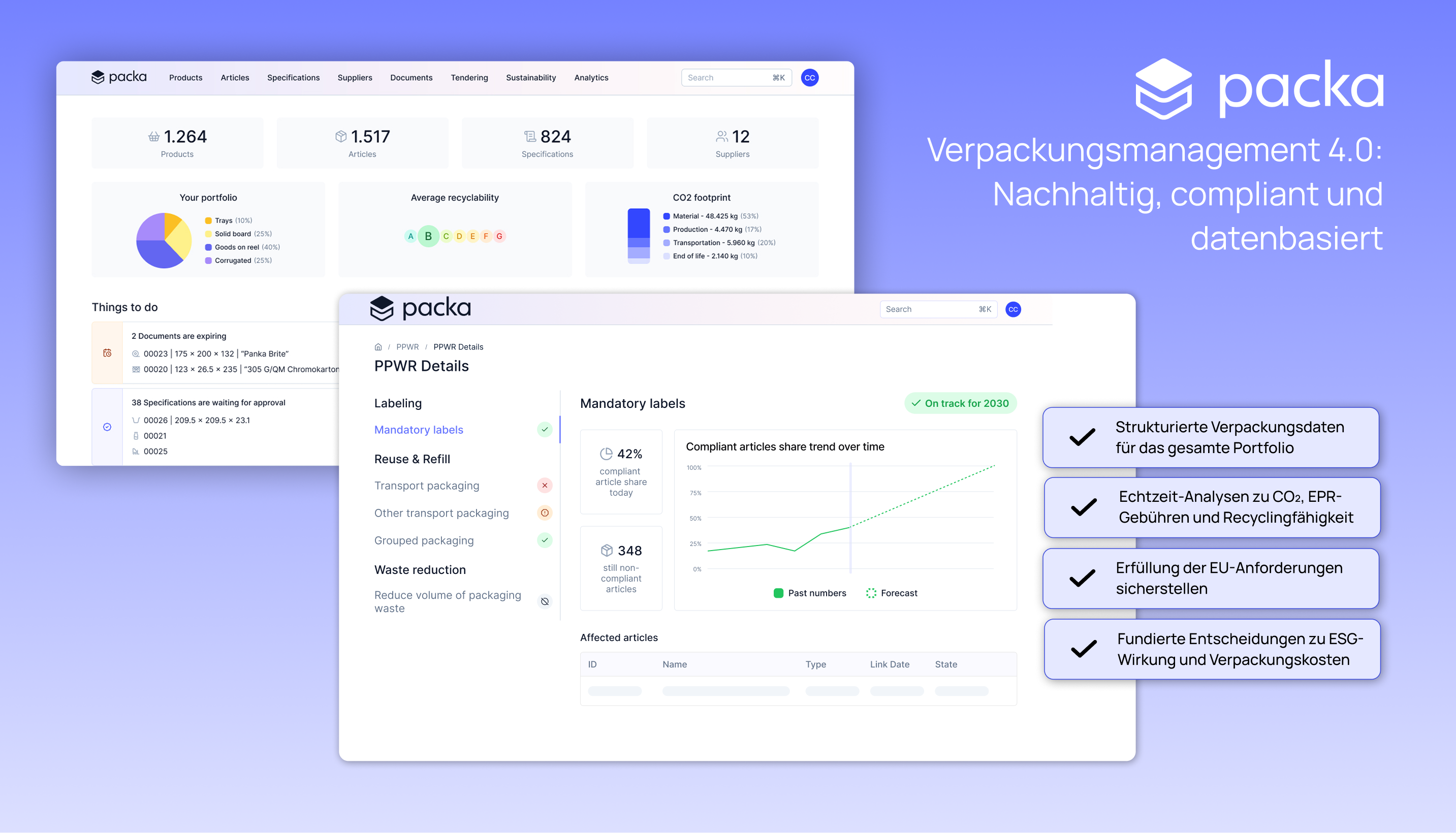 Möchten Sie sehen, wie Packa Verpackungsdaten, Nachhaltigkeit, Compliance, EPR-Gebühren und Dokumentation in einem intelligenten Verpackungsmanagement-Tool zusammenführt? Buchen Sie eine Demo und entdecken Sie, wie Ihr Team Verpackungsmanagement und PPWR-Compliance effizienter steuern kann.