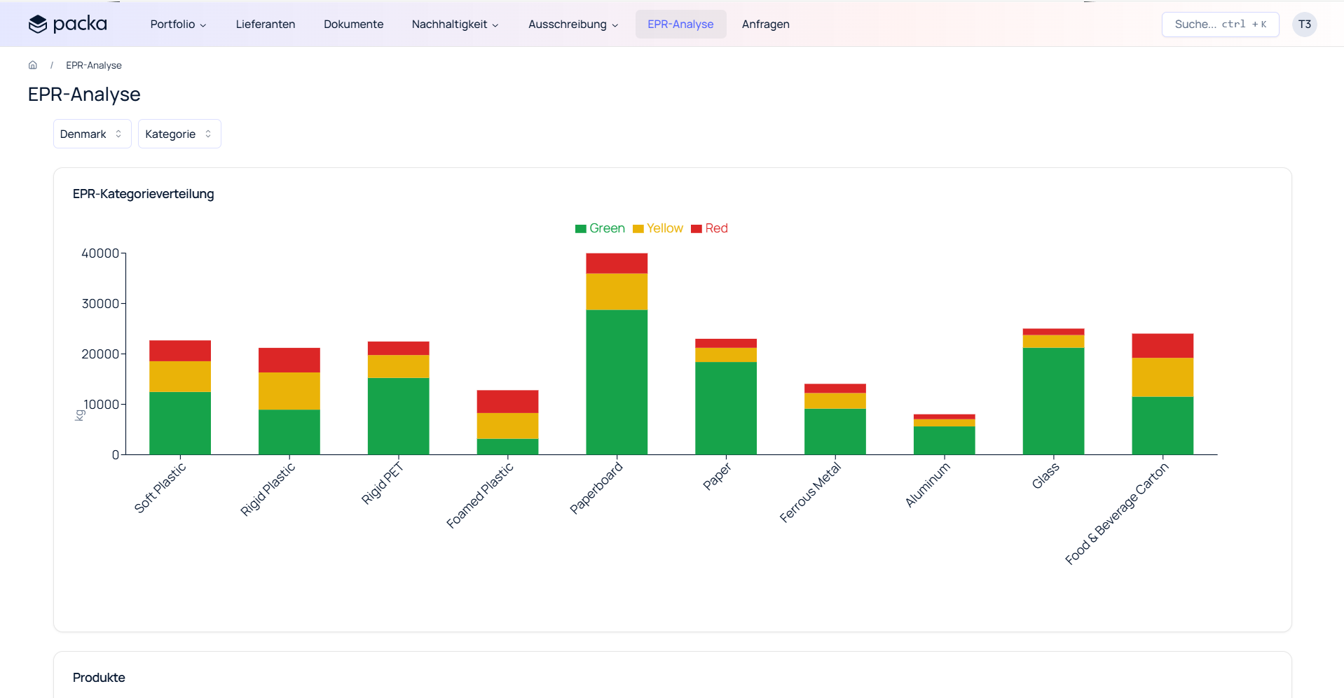 Packa hilft Verpackungsteams dabei, EPR strukturierter zu analysieren. Innerhalb der Plattform können Teams EPR-Daten nach Produkt, Land und Materialkategorie einsehen, mit länderspezifischer Sicht auf die jeweils relevante Reporting-Logik. Je nach Markt kann dies beispielsweise Kategorisierung, gemeldete Mengen und – wo anwendbar – gebührenbezogene Kennzahlen wie Gebühren pro Kilogramm oder Gebühren pro Einheit umfassen.