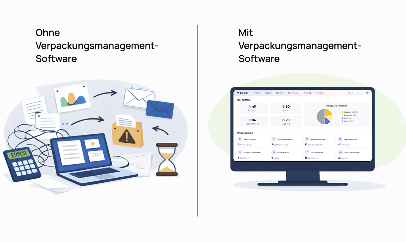 Statt mit isolierten Tools zu arbeiten, bietet Packa eine echte All-in-One-Lösung für professionelles Verpackungsmanagement.